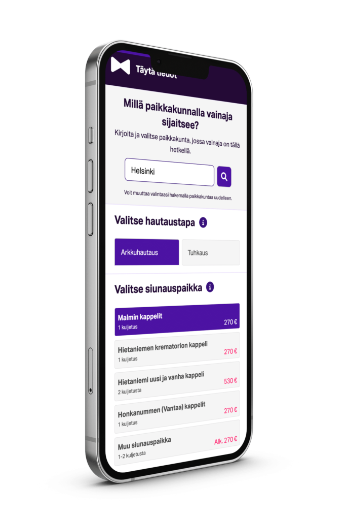Tutustu hautauspalveluiden ja -tuotteiden hinnastoon ja suunnittele hautajaiset alle viidessä minuutissa.