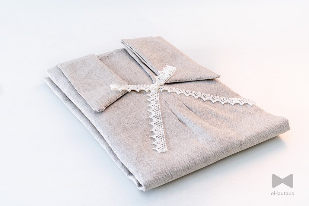 Tuote sisältää kauniin pellavaisen arkkupaidan sekä puuvillaiset sukat.