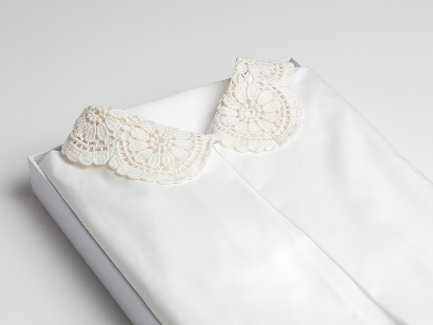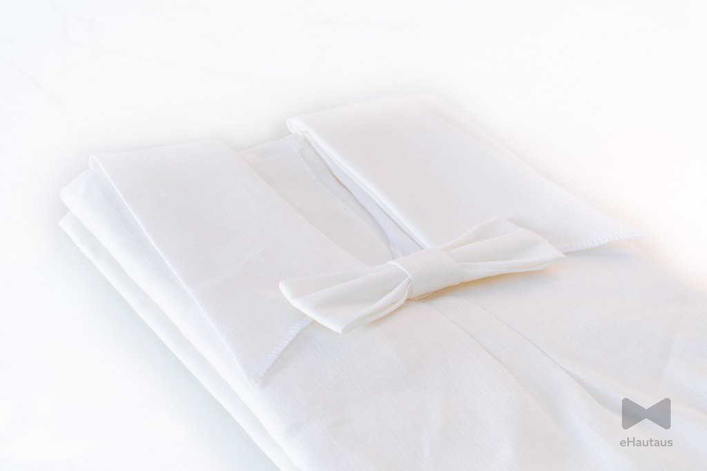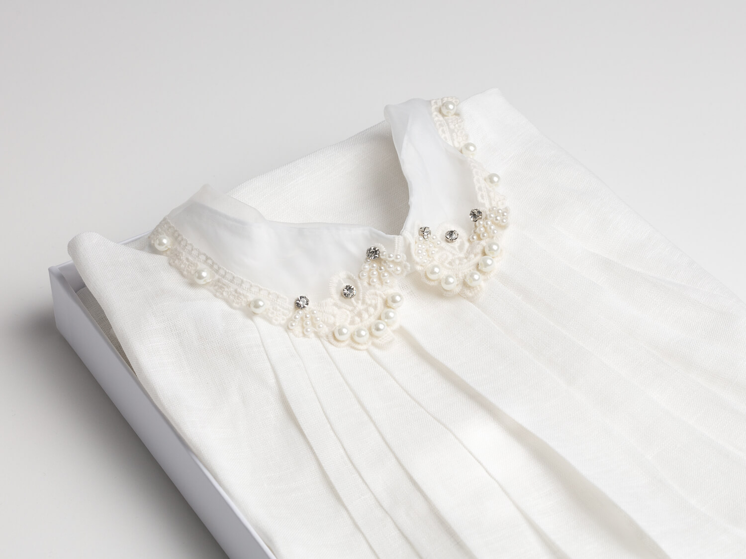 Tuote sisältää kauniin vaalean pellavaisen arkkupaidan sekä puuvillaiset sukat.
