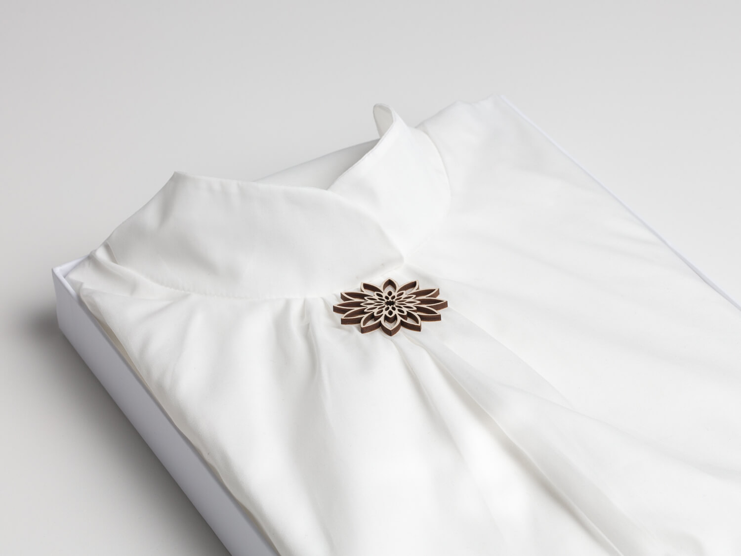 Kaksiosainen kaulus, pienet laskokset kauluksen edessä, sekä kotimaassa valmistettu puinen koru laskosten päällä. 100% puuvilla.